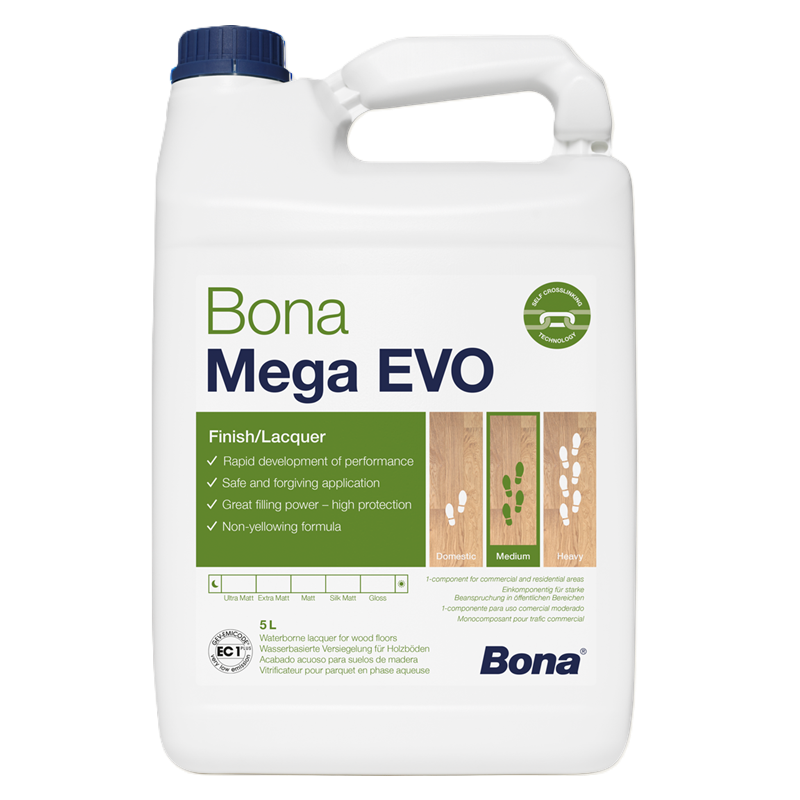 Bona Mega EVO to jednoskładnikowy lakier poliuretanowo akrylowy nowej generacji, wykorzystujący najnowocześniejszą technologię sieciowania. Rekomendowany dla podłóg drewnianych oraz innych wewnętrznych powierzchniach drewnianych w domach i miejscach użyteczności publicznej tj. biura czy małe sklepy. W porównaniu do lakieru Bona Mega nadaje drewnu jaśniejszy odcień.