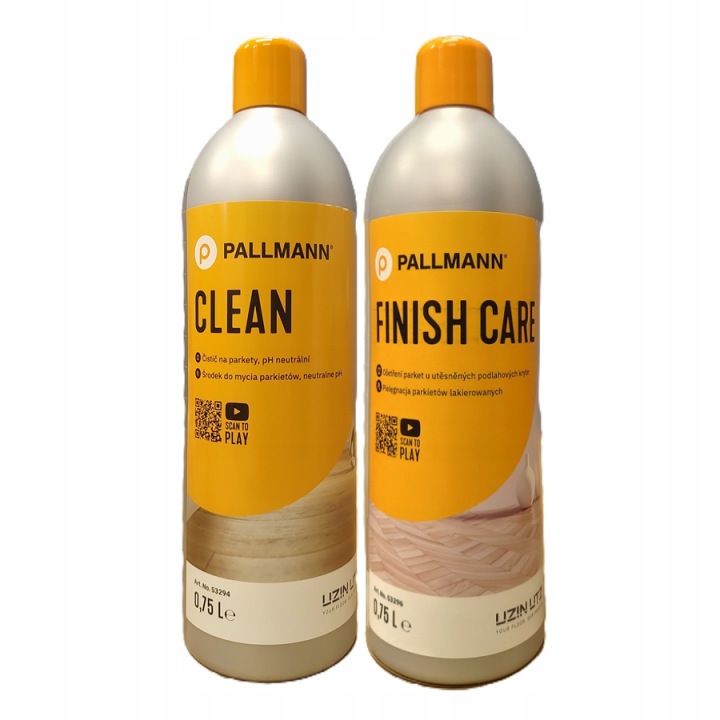 Zestaw do pielęgnacji i konserwacji podłóg lakierowanych Pallmann. W zestawie znajduje się produkt Pallmann Clean na bazie wodnej przeznaczony do usuwania zabrudzeń z powierzchni podłogi oraz Pallmann Finish Care środek do ochrony i konserwacji lakierowanych podłóg drewnianych.